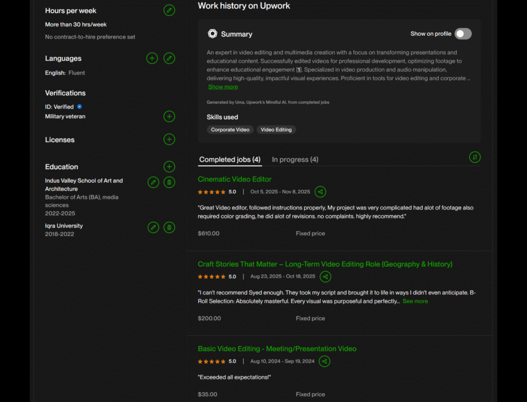 💡 "Professional, responsive, and highly skilled! The video editing for my Upwork project was flawless perfect pacing, smooth transitions, and great attention to detail." 🎞️👏